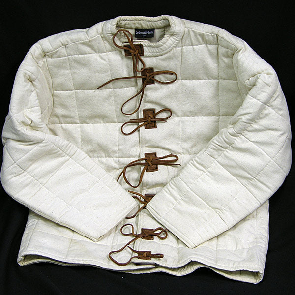 This GDFB style of arming jacket has leather-tie closures with leather reinforced eyelets. Crafted in heavy-duty padded canvas, it has excellent blow-absorbing properties when worn separately and provides superior protection from cuts when worn under mail or plate. We also offer a wide selection of helmets and other protective clothing for the en actor.