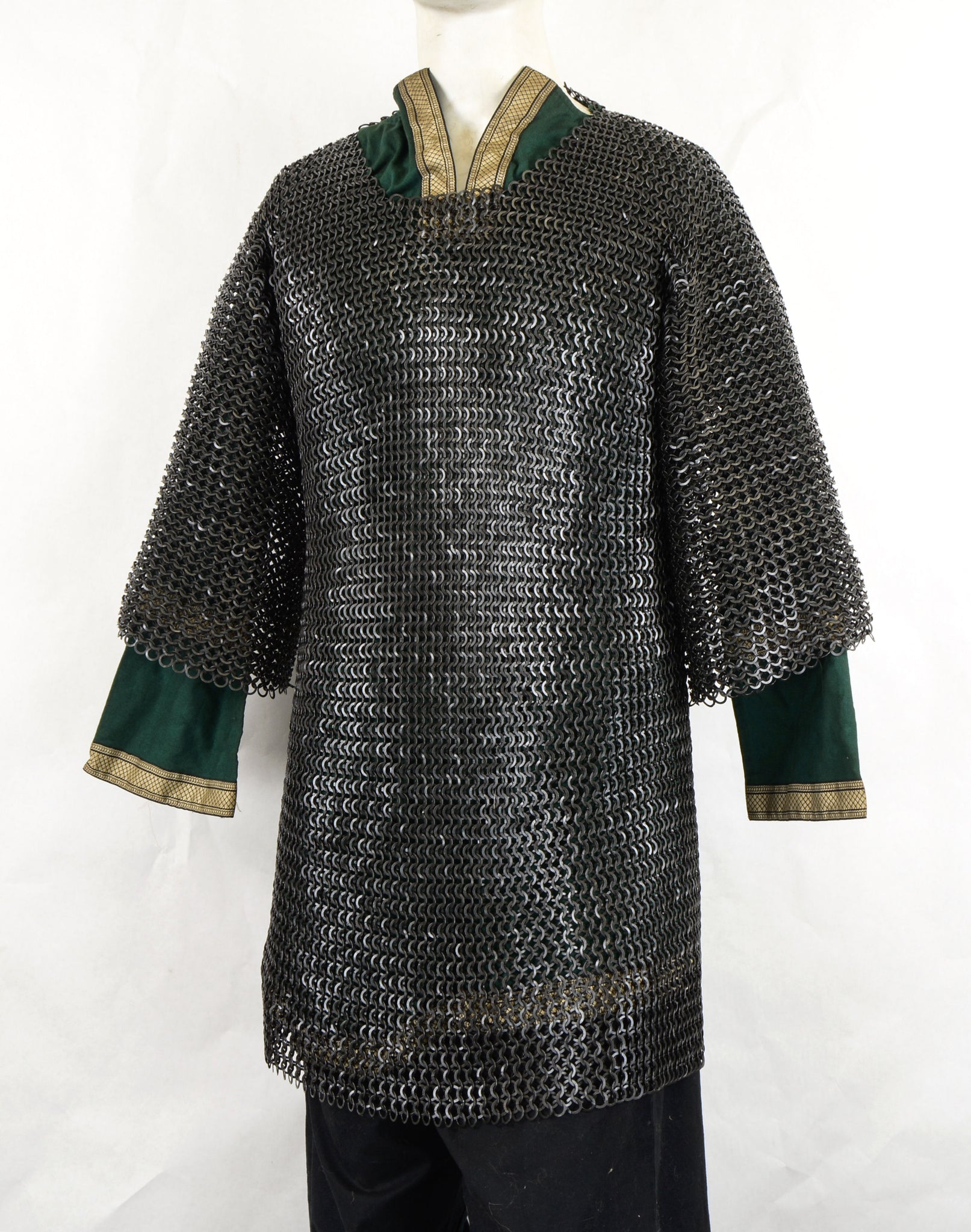 This chainmail haubergeon is crafted from butted rings of blackened mild steel. The rings measure 10 mm in diameter and 16 gauge in thickness.