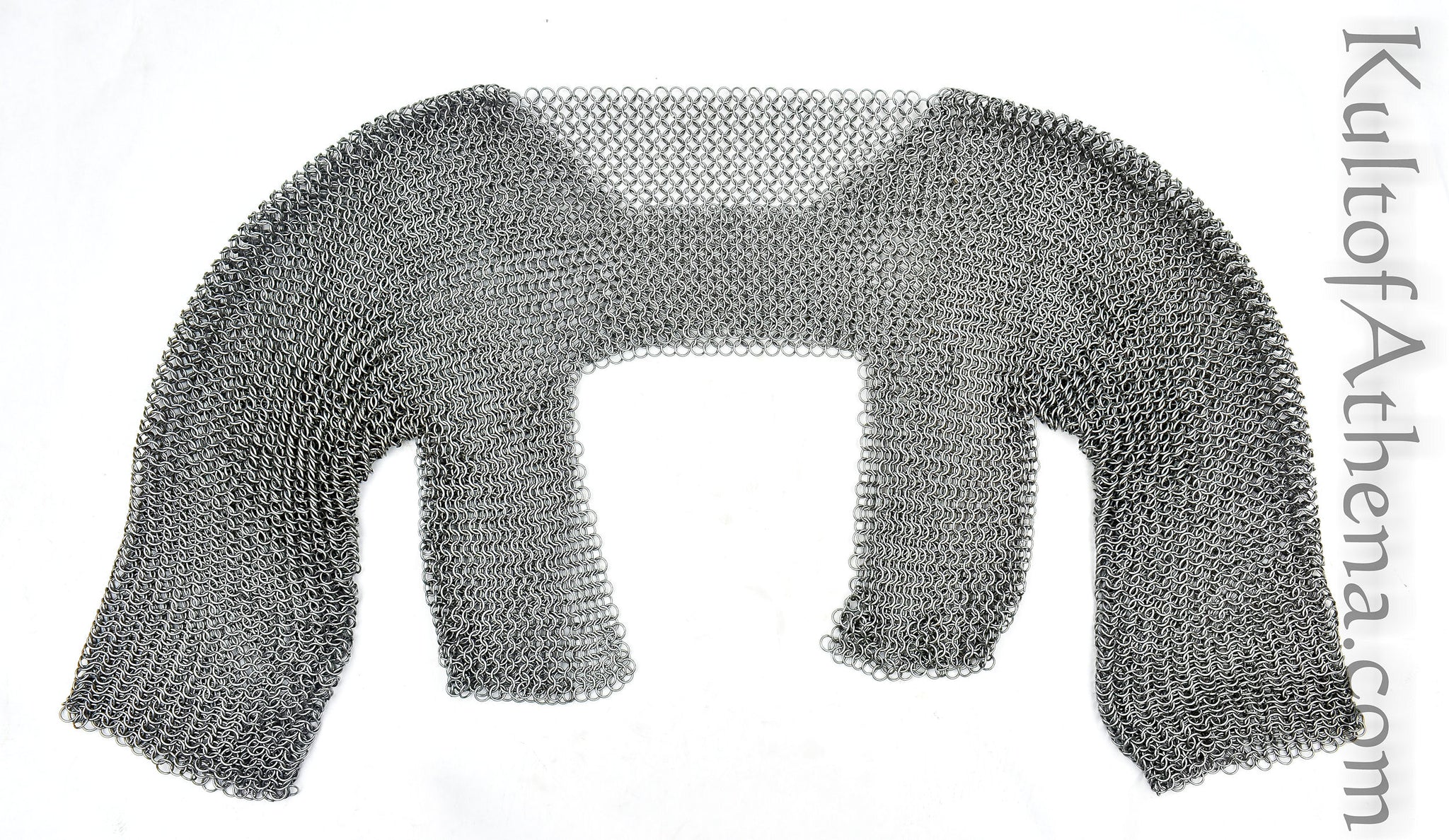 This half-hauberk of chainmail is designed to fill in the gaps between plate armor by having an encompassing underlayer of mail over critical areas. The design puts mail where it needs to be and fills in defensive gaps in the armpits, arms, torso sides and collar. By omitting the lower half of the torso (which is already well-protected by a plate or brigandine cuirass) it greatly reduces the total weight of your armored defense. The torso of the armor has been designed to have a tapered form which follows the shape of the torso so that it lays flat against your padded armor instead of hanging straight down where it would be considerably less useful.