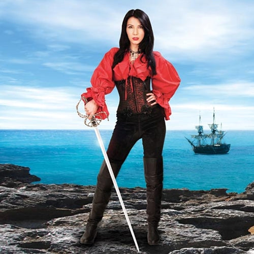 What female of the high seas would not want this rich, red brocade, under-bust style corset with black satin bows and piping? The long laces and generous modesty panel at rear allow for a shapely fit every time. Designed in England. Available in S, M, and L.