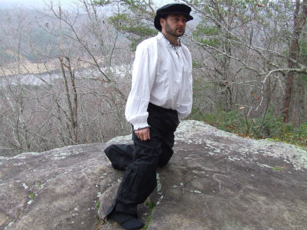 Bright white period shirt with black edged Tudor collar. Hook and eye closure on collar. 100% cotton machine wash and dry.