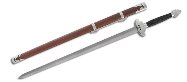 Designed by noted martial artist and teacher Scott M. Rodell, Hanwei's Chinese Cutting Sword provides a purpose-built weapon for the art of cutting in Chinese Swordsmanship. Utilizing a special steel formulation and heat treatment regimen developed by Hanwei, the blade optimizes edge hardness and body toughness, ideal characteristics in a cutting sword. The elegantly simple steel fittings reinforce the sword's mission, providing uncluttered lines while still remaining true to tradition. The black leather-over-cranberry rayskin grip ensures secure handling. A rosewood scabbard with fittings matching the hilt completes an attractive package.