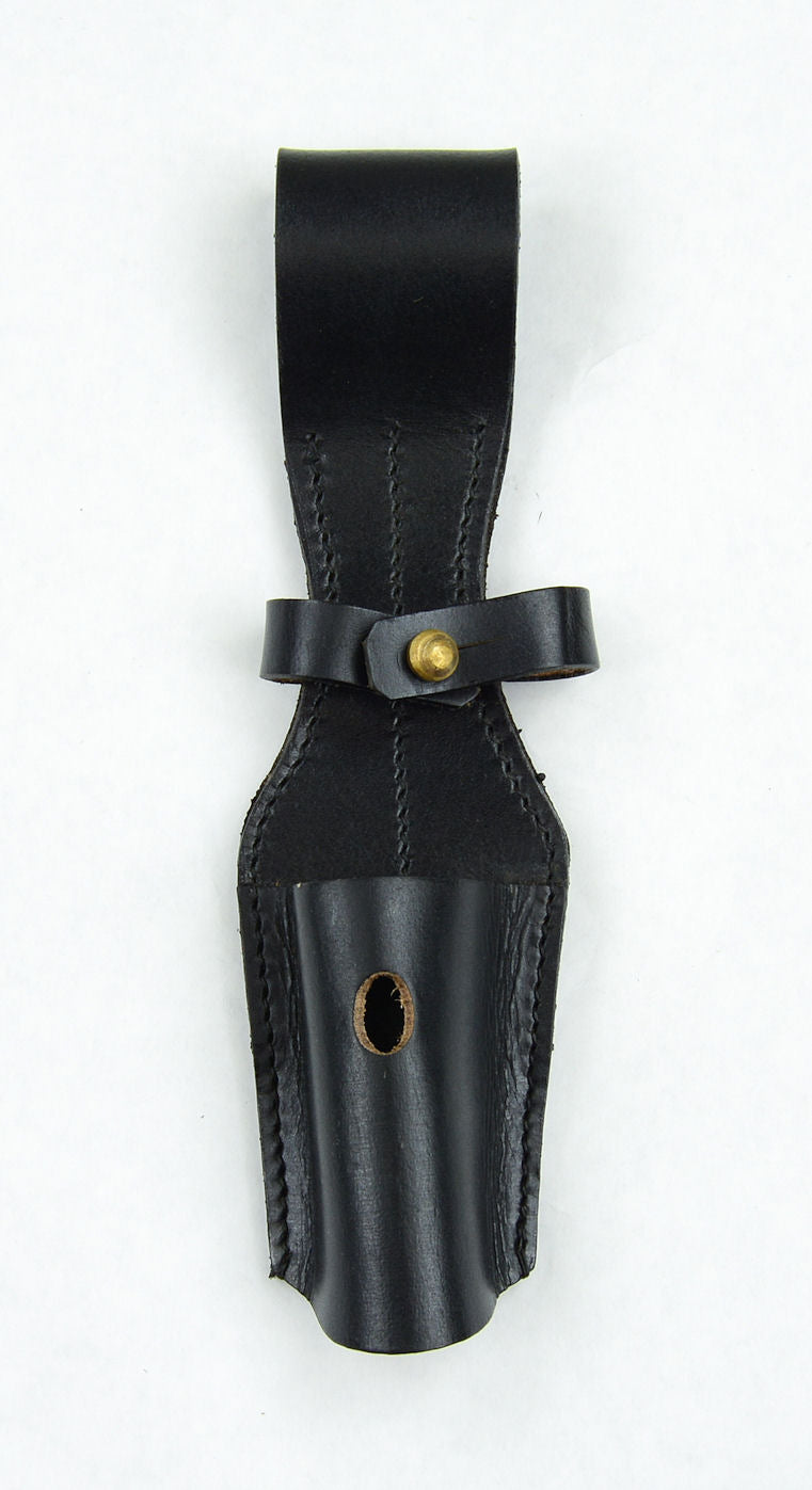 This dagger holster is constructed from strong, stitched leather. The holster has a cut out that will fit many scabbard and sheath hanging pins. The retaining strap is closed with a brass button and can be used to further secure the grip.