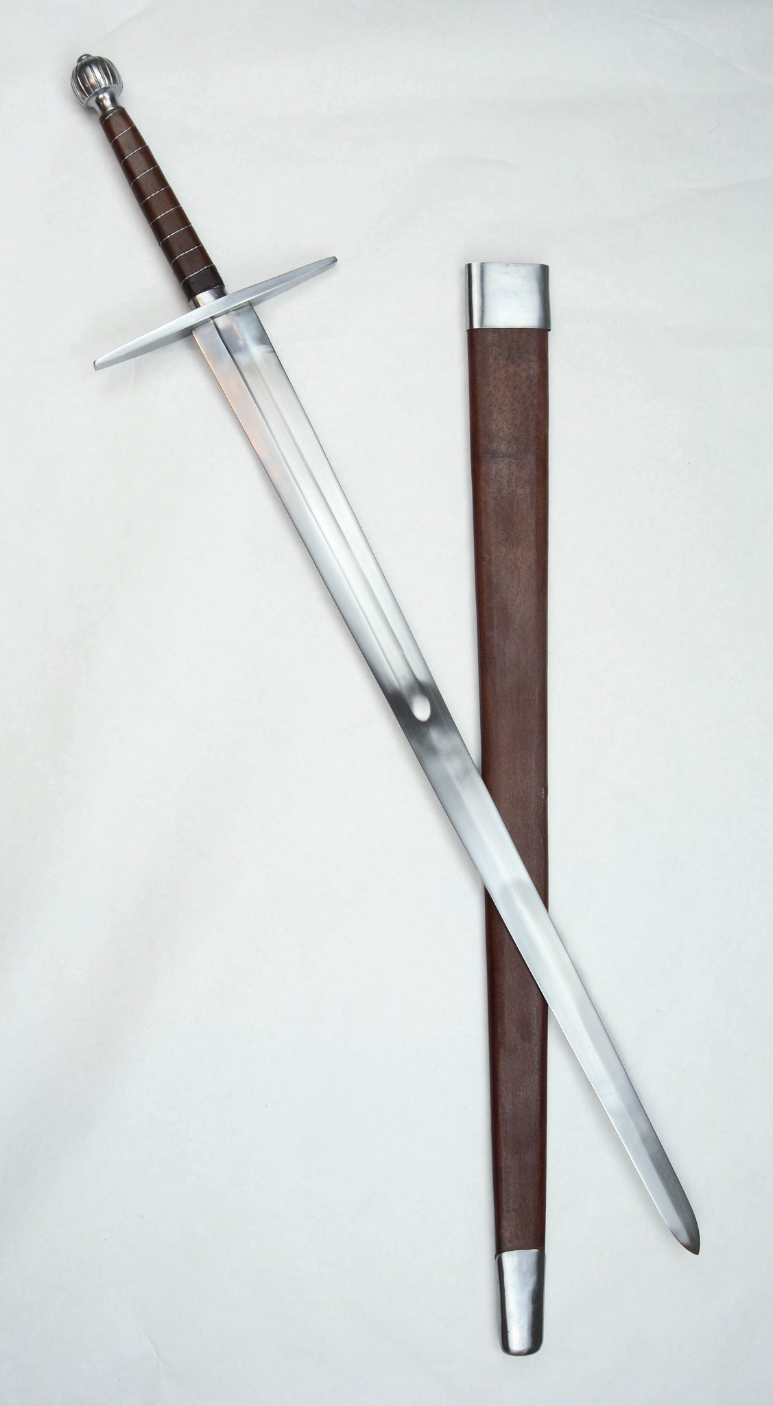 This Medieval Longsword has a blade of high carbon steel; the hilt is steel and the wooden grip is overlaid in leather and steel wire. The scabbard is wood with a tight wrap of leather and steel fittings.