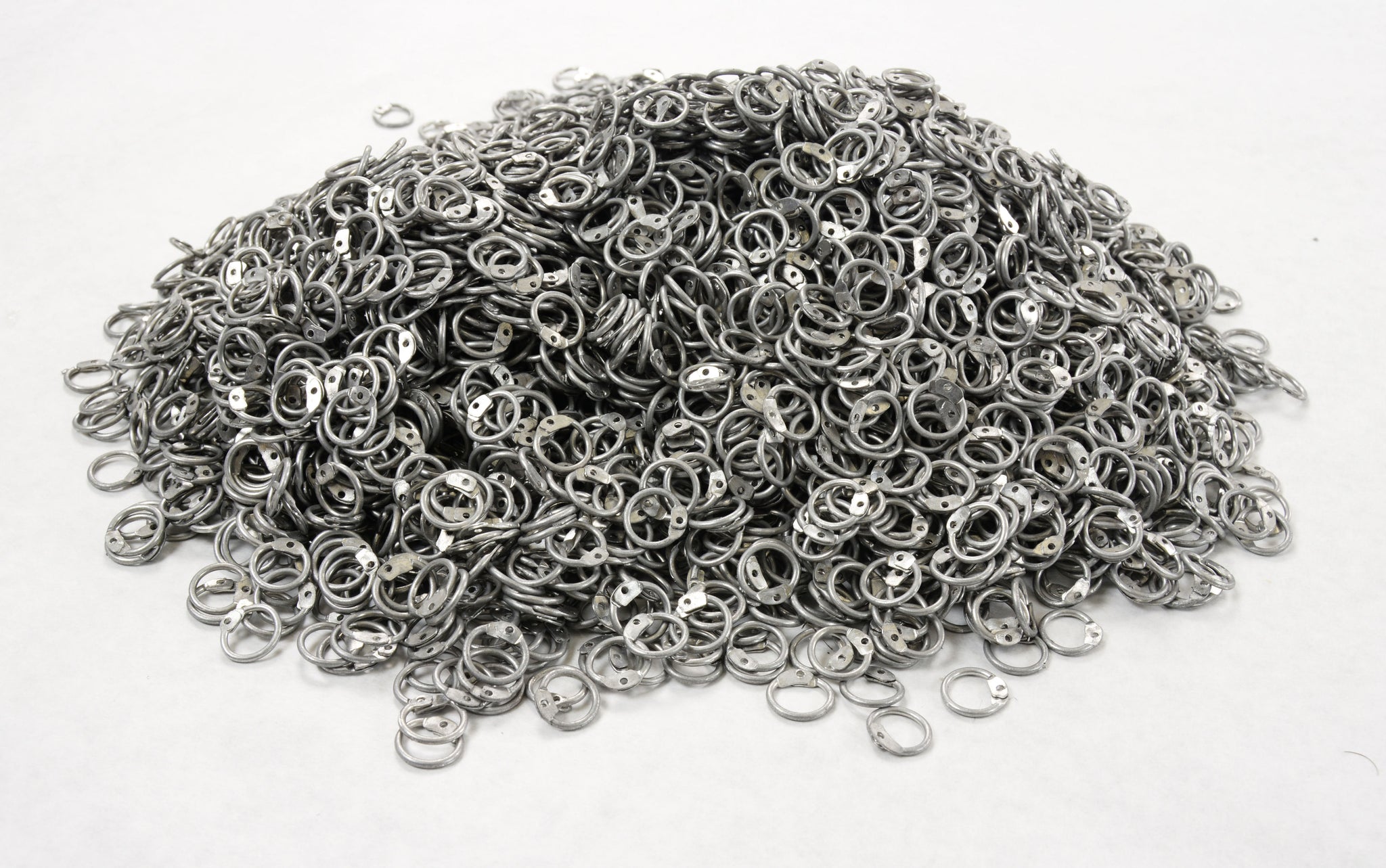 This 1 kg pack of loose chainmail rings are crafted from aluminum; they are intended to be dome-riveted to close the links. The individual rings are 10 mm in diameter and 16 gauge in thickness. Rivets are included with which to close the rings.