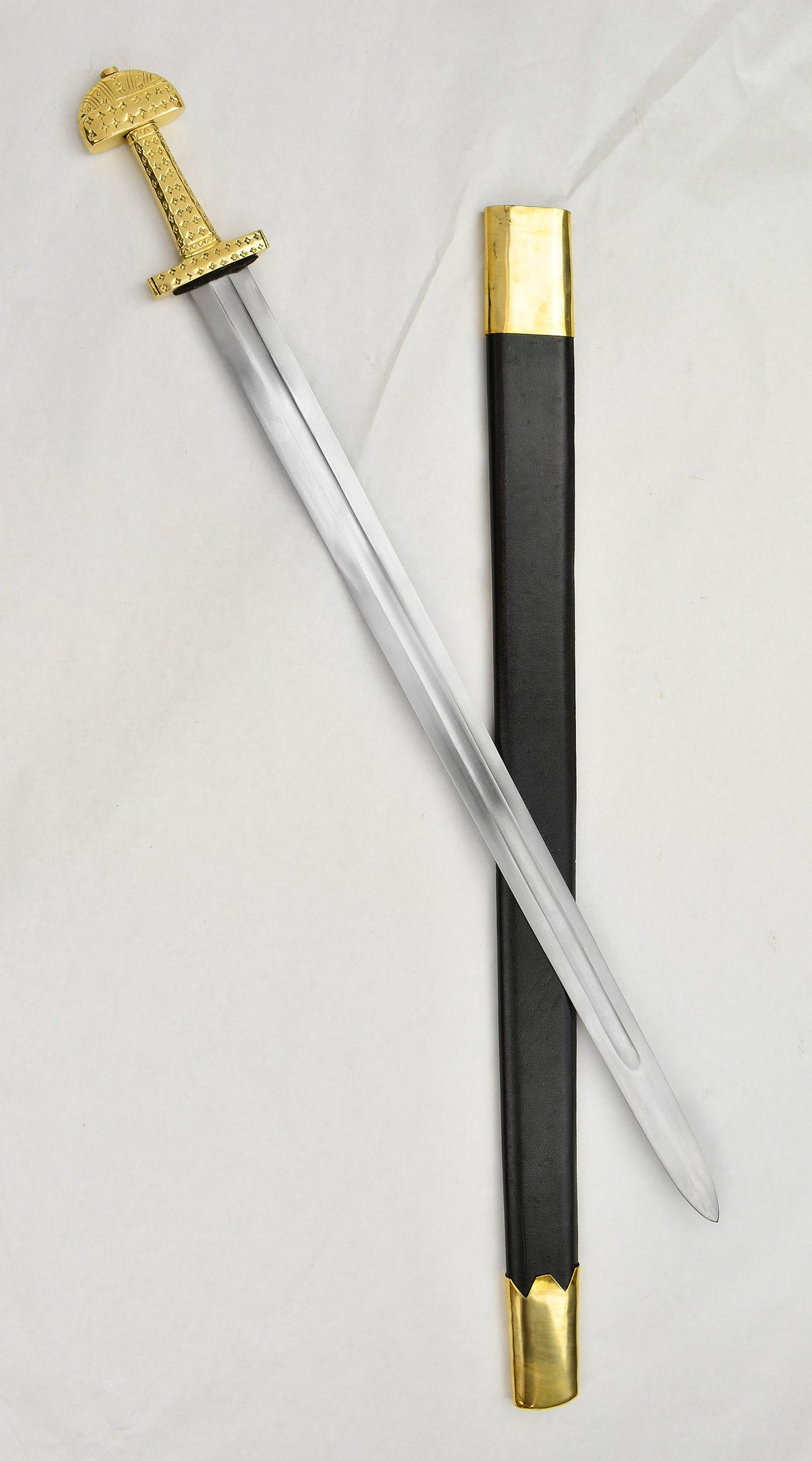 This early Viking sword has a blade of tempered EN45 high carbon steel which is durably mounted into a hilt of solid cast brass. The guard has a tab of black felt which cushions the guard and protects it from scratches when in contact with the scabbard. This felt tab can be removed if desired. The scabbard is wood wrapped over with stitched leather and finished with brass fittings.