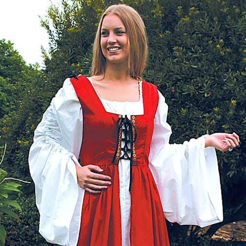The Fair Maiden's Dress; a perfect dress for the faire or going off to market. This colorful, 16th century styled dress features coordinating front trim and re-enforced boning in the front bodice for extra strong tight lacing. We have paired this piece with the Celtic Chemise (sold separately), however it will look lovely with any of our other chemises. The Fair Maiden's dress is available in three colors: red, green and blue. Poly/cotton blend. Sizes S/M, L/XL and XXL (add $4.00). Dry Clean Only.