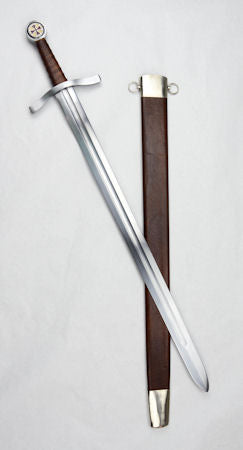 This Templar Sword has a blade of high carbon steel; the hilt is steel with a wooden grip overlaid in leather. The inset cross on both sides of the pommel is finished with an enamel filler. The wood-core scabbard is bound in leather and completed with steel fittings and hanging rings.