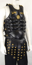 This Muscled Cuirass is a breastplate and backplate of hard synthetic material with an outer layer of form-fitted black leather. The armor is finished with decorative brass fittings and hanging tassets bands. An ideal cuirass for a Greek hero or Roman gladiator.