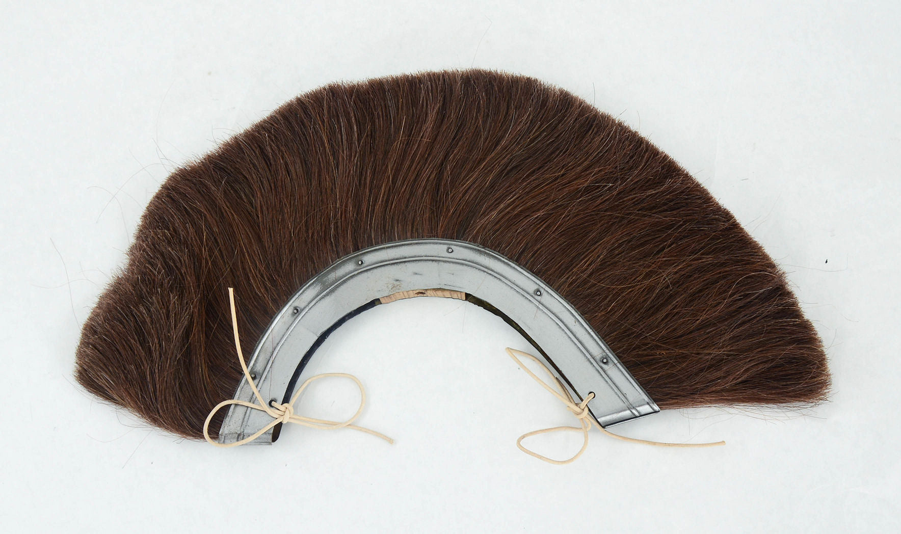 This Roman Helmet Crest is crafted from horsehair which is fitted to a steel base. It has a pre-drilled hole in its base that allow it to be mounted onto a crest holder. It can be used both as a transverse or front-to-back crest, depending on the type of holder used. Leather cords to tie down the crest are included.
