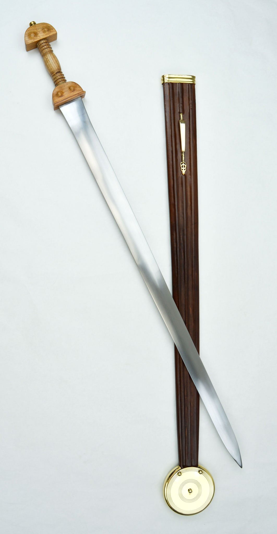 The 2nd Century Long Spatha has a blade crafted from high carbon steel and it has a hilt of carved wood. A brass pommel nut secures the sword tang to the hilt. It is paired with a quality wood-core scabbard which is overlaid in stitched leather and finished with brass fittings.
