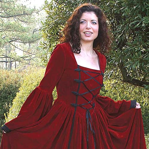 You will feel like you've stepped into the pages of a fairy tale when you wear this elegant gown. Made of a heavy, red 100% cotton velvet, the dress has full bell sleeves and a generous full skirt. Matching handmade frogs compliment the lace-up front, while the back laces as well. Dry Clean Only. Available in sizes, S, M, L, XL and XXL (add $4.00).