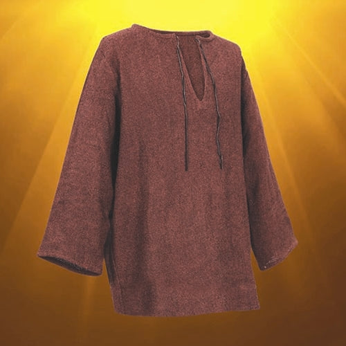 This Scotsman Shirt is made of rough textured, yet very soft long-sleeve shirt with leather ties on both neckline and shoulders for the kilt. Brown poly/cotton. Choose from S/M or L/XL.