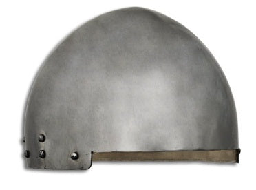 The secret helmet dates from the 14th Century and was designed for wear under a great helmet or tilting helmet for extra protection. Crafted in 14 gauge steel with an adjustable leather liner and chinstrap.