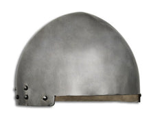 The secret helm dates from the 14th. Century and was designed for wear under a great helm or tilting helm for extra protection. Crafted in 14 gauge steel with an adjustable leather liner and chinstrap.
