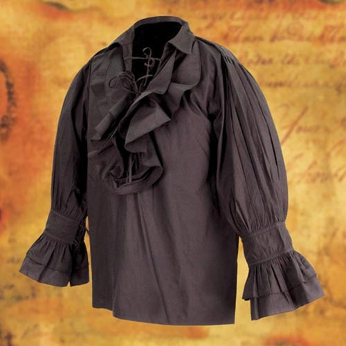 This Tortuga shirt is a generous yet dashing shirt with 6 lace-up ties in the front and 2 lace-up ties at the wrists. This shirt is available in black, white or red. Choose from S/M or L/XL. Polyester cotton blend.