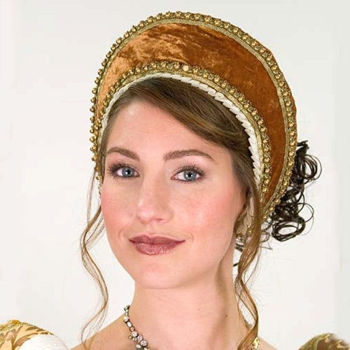 The finishing touch for many of our period gowns. This simple, yet elegant hat has been designed to match many of our dresses seen throughout our catalog or can be used with any of your existing outfits. Stiff interior with cotton velvet exterior. White Tudor edging with gold trim & ties complete this cute accessory. One size. Order gold, burgundy, dark blue or black.