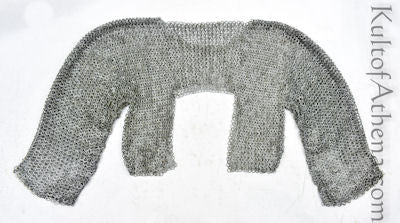 This half-hauberk of chainmail is designed to fill in the gaps between plate armor by having an encompassing underlayer of mail over critical areas. The design puts mail where it needs to be and fills in defensive gaps in the armpits, arms, torso sides and collar. By omitting the lower half of the torso (which is already well-protected by a plate or brigandine cuirass) it greatly reduces the total weight of your armored defense. The torso of the armor has been designed to have a tapered form which follows the shape of the torso so that it lays flat against your padded armor instead of hanging straight down where it would be considerably less useful.